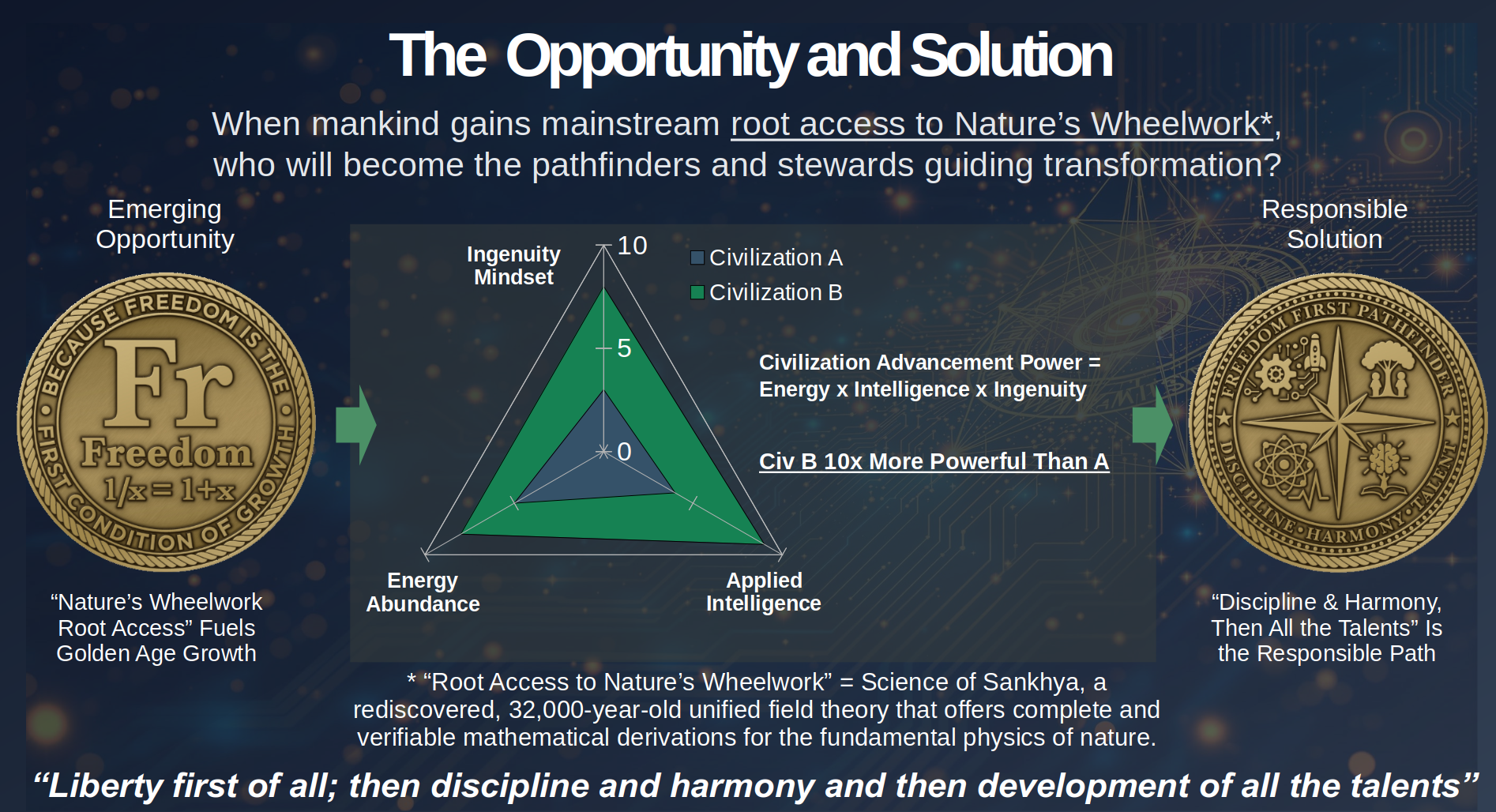 Visit the links above (Say No To Fools Gold, Harmonize, Doorway to Freedom, Start With The Answer, Say Yes To FFP Vision, Science of Freedom Foundations Course) to gain a glimpse into the vision and path towards adopting an Ingenuity Mindset that can open the doors to infinite freedom and unlimited exploration of the cosmic scene. And if this resonates with you, please join the community to begin your journey as a freedom first pathfinder, participating as a leader and innovator in the next chapter of mankind's golden era.